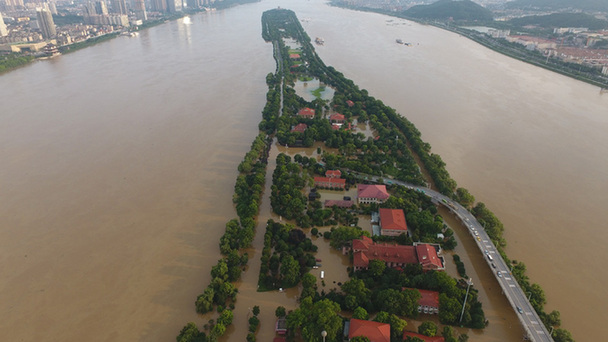 7月2日,受強降雨持續影響,湖南省境內江河湖泊水位暴漲,長沙湘江突破有記錄以來的歷史最高水位,橘子洲景區遭洪水“穿洲”。