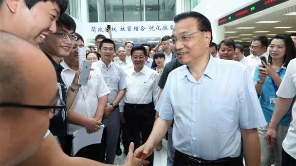 在出席夏季達沃斯論壇期間,中共中央政治局常委、國務院總理李克強在遼寧大連考察。這是6月26日,李克強在遼寧自貿試驗區大連片區綜合服務大廳與在現場辦事的企業人員交流。新華社記者 龐興雷 攝