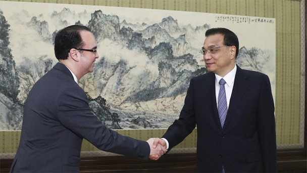6月30日,國務院總理李克強在北京中南海紫光閣會見來華進行正式訪問的菲律賓外長卡耶塔諾。新華社記者 謝環馳 攝  6月30日,國務院總理李克強在北京中南海紫光閣會見來華進行正式訪問的菲律賓外長卡耶塔諾。