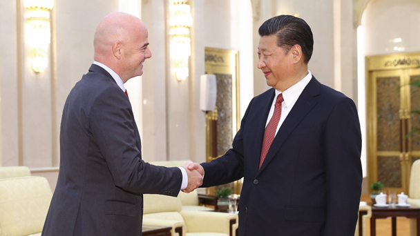 6月14日,國家主席習近平在北京人民大會堂會見國際足聯主席因凡蒂諾。習近平贊賞因凡蒂諾就任國際足聯主席后致力于足球事業發展、關注中國足球事業,強調中方將積極支持國際足聯工作,愿為推動世界足球運動發展做出應有貢獻。