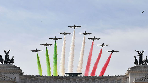 當地時間6月2日,意大利共和國舉行閱兵儀式慶祝建國71周年。當天在意大利羅馬,特技飛行隊在空中拉出代表意大利國旗顏色的紅白綠三色煙霧。