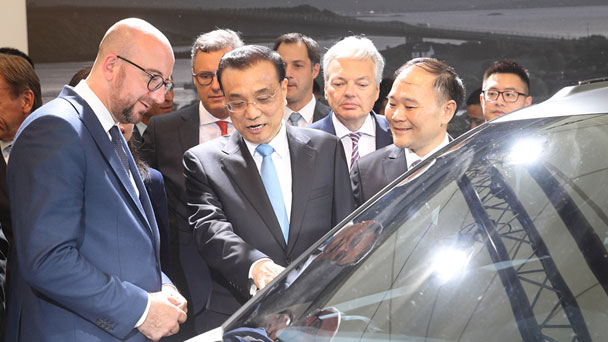 當地時間6月2日晚,國務院總理李克強在布魯塞爾與比利時首相米歇爾共同參觀吉利沃爾沃汽車創新成果展。