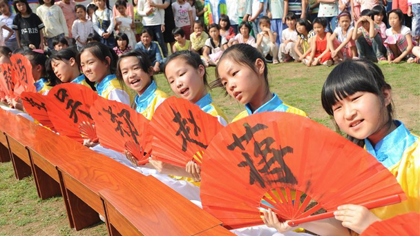 5月26日,湖南省郴州市嘉禾縣石橋鎮(zhèn)石市小學(xué)學(xué)生表演國學(xué)群舞《國學(xué)娃 百家姓》。“六一”前夕,各地兒童參與各具特色的國學(xué)主題活動(dòng),以文藝演出、書畫展覽、國學(xué)經(jīng)典誦讀等形式迎接自己的節(jié)日。