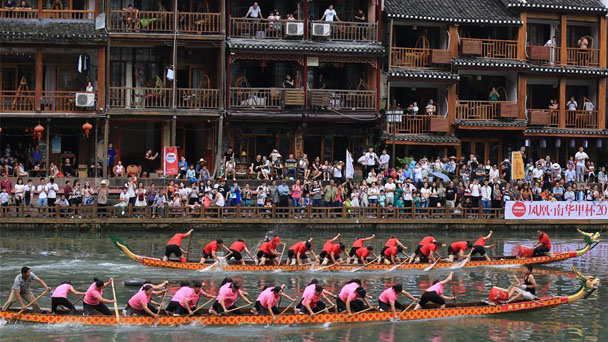 當(dāng)日,湖南省湘西土家族苗族自治州鳳凰古城2017年端午節(jié)龍舟賽在沱江上舉行,來自當(dāng)?shù)氐?9支隊(duì)伍參賽,吸引眾多游客前來觀看。當(dāng)日,湖南省湘西土家族苗族自治州鳳凰古城2017年端午節(jié)龍舟賽在沱江上舉行,來自當(dāng)?shù)氐?9支隊(duì)伍參賽,吸引眾多游客前來觀看。