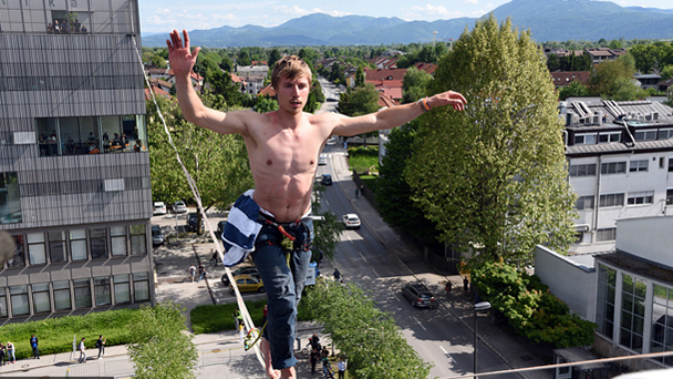 斯洛文尼亞一學生為省時間高空走繩索去上課