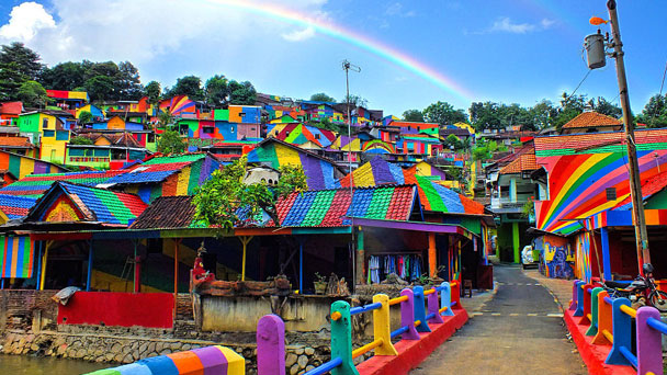 印度尼西亞爪哇省蘭薩里有一個不知名的貧困村Kampung Pelangi,在當?shù)卣痛迕竦墓餐ο拢琄ampung Pelangi搖身一變成了光彩奪目的“彩虹村”,吸引著世界各地的游客前來游玩。