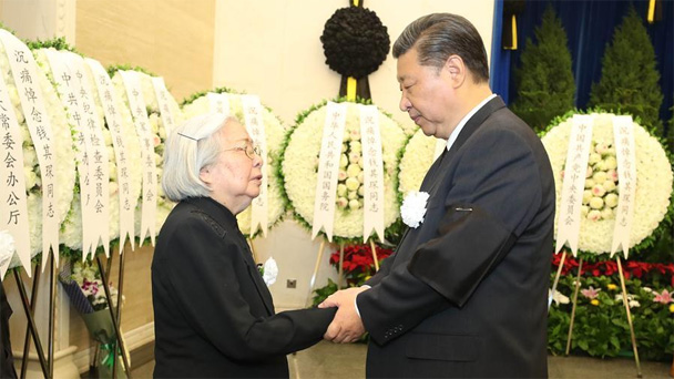 5月18日,錢其琛同志遺體在北京八寶山革命公墓火化。習近平、李克強、張德江、俞正聲、劉云山、王岐山、張高麗、胡錦濤等前往八寶山送別。這是習近平與錢其琛親屬握手,表示深切慰問。新華社記者 馬占成 攝