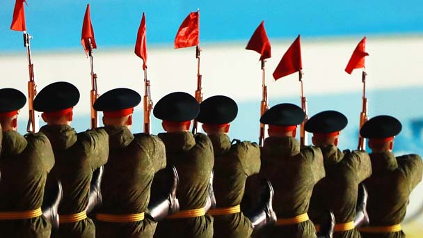 當地時間2017年5月3日,俄羅斯士兵在莫斯科紅場進行閱兵彩排,為5月9日的勝利日大閱兵做準備。