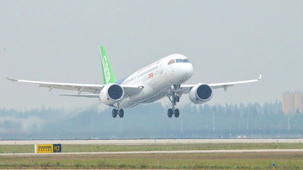 5月5日,中國首款國際主流水準的干線客機C919在上海浦東國際機場首飛。新華社記者 丁汀 攝  5月5日,中國首款國際主流水準的干線客機C919在上海浦東國際機場首飛。