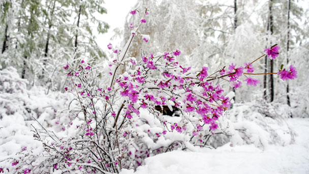 立夏時節,內蒙古呼倫貝爾的畢拉河林業局達爾濱湖國家森林公園迎來降雪,雪花掛在微微泛綠的枝頭上,美不勝收。