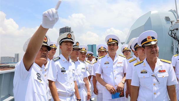 5月6日,在越南胡志明市,越方軍官團參觀中國海軍遠航訪問編隊導彈驅逐艦長春艦。當地時間6日,中國海軍遠航訪問編隊抵達越南胡志明市,開始為期4天的友好訪問。