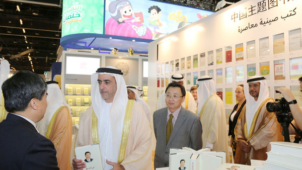 4月26日,在阿聯酋阿布扎比,阿聯酋副總理兼內政部長賽義夫·本·扎耶德·阿勒納哈揚(前左二)參觀展出的《習近平談治國理政》阿文版。為進一步增強絲路精神的廣泛認同,深化中阿合作,促進文明互鑒,《習近平談治國理政》阿文版研討推介會26日在第27屆阿布扎比國際書展中國主賓國活動上舉行。