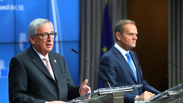 4月29日,在比利時首都布魯塞爾的歐盟總部,歐盟委員會主席容克(左)和歐洲理事會主席圖斯克在會議閉幕后出席新聞發布會。新華社記者龔兵攝  4月29日,在比利時首都布魯塞爾的歐盟總部,歐盟委員會主席容克(左)和歐洲理事會主席圖斯克在會議閉幕后出席新聞發布會。