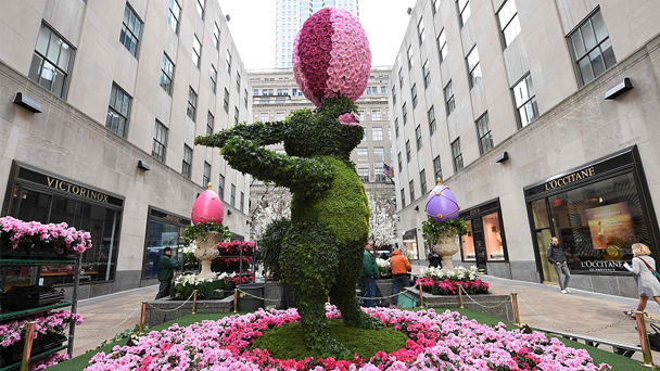 近日,美國紐約洛克菲勒中心海峽花園中出現了一只高達12英尺(約3.65米)的“復活節兔子”,這只用常春藤與苔蘚組合修剪而成的兔子頭上頂著一只由雛菊編成的巨大彩蛋。