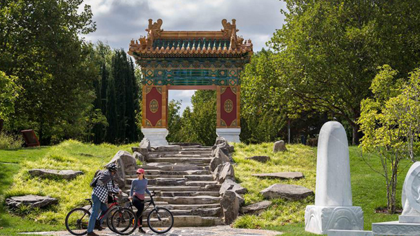 4月2日,在澳大利亞堪培拉,人們在北京花園內騎行。北京花園位于堪培拉市中心格里芬湖畔,是一座面積近1萬平方米的中式花園,于2014年竣工并對公眾開放。北京花園位于堪培拉市中心格里芬湖畔,是一座面積近1萬平方米的中式花園,于2014年竣工并對公眾開放。