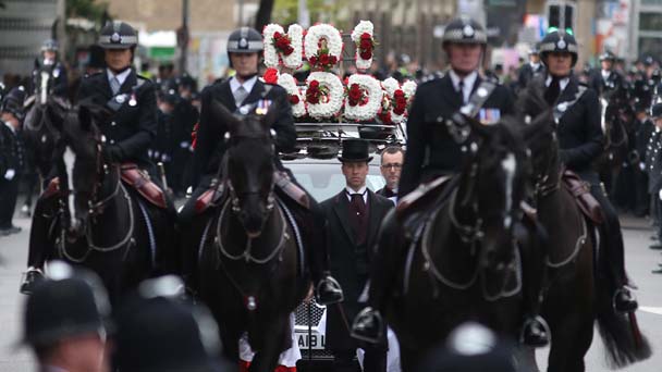 據(jù)英國廣播公司網(wǎng)站報(bào)道,當(dāng)?shù)貢r(shí)間4月10日,英國恐襲事件中殉職警察基思·帕爾默的葬禮在倫敦中心南華克大教堂舉行。