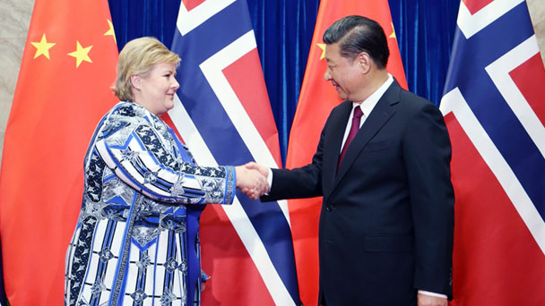 4月10日,國家主席習(xí)近平在北京人民大會堂會見挪威首相索爾貝格。新華社記者姚大偉攝