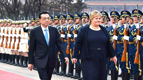 4月7日,國務院總理李克強在北京人民大會堂同來華進行正式訪問的挪威首相索爾貝格舉行會談。會談前,李克強在人民大會堂東門外廣場為索爾貝格舉行歡迎儀式。