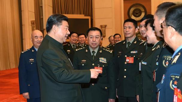 3月12日,中共中央總書記、國家主席、中央軍委主席習近平出席十二屆全國人大五次會議解放軍代表團全體會議并發表重要講話。