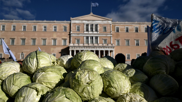希臘農民上街游行 國會大樓前發洋白菜示威