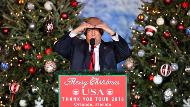美國當選總統特朗普12月16日攜候任副總統彭斯在奧蘭多舉行圣誕主題答謝集會。