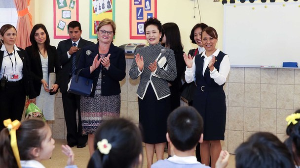 當(dāng)?shù)貢r(shí)間21日上午,國家主席習(xí)近平夫人彭麗媛在利馬參觀若望二十三世秘中學(xué)校。