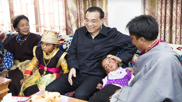 李克強總理7月25日到西藏自治區考察。首先來到林芝,一下飛機直奔米林縣羌納鄉西嘎門巴村。這是一個移民村,村民由貧困地區搬遷而來。李克強走進村民貢桑家中,和他們一家6口坐在沙發上拉起家常。