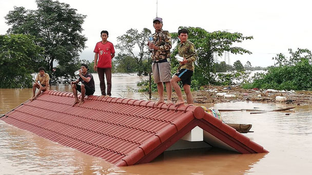 7月24日,在老撾阿速坡,居民在屋頂躲避潰壩事故帶來的洪水。老撾南部阿速坡省一水電站23日晚發生潰壩事故,已導致數人死亡、數百人失蹤。老撾南部阿速坡省一水電站23日晚發生潰壩事故,已導致數人死亡、數百人失蹤。