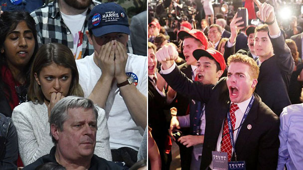 美國大選今日揭曉,原本美國媒體民調預測優勢明顯的希拉里,目前選情不妙;不被媒體看好的特朗普反而勢如破竹,選票領先希拉里,且獲得多個此前被認為是重要“搖擺州”的勝利。共和黨和民主黨的各自支持陣營內,一面歡呼雀躍,一面黯然神傷。