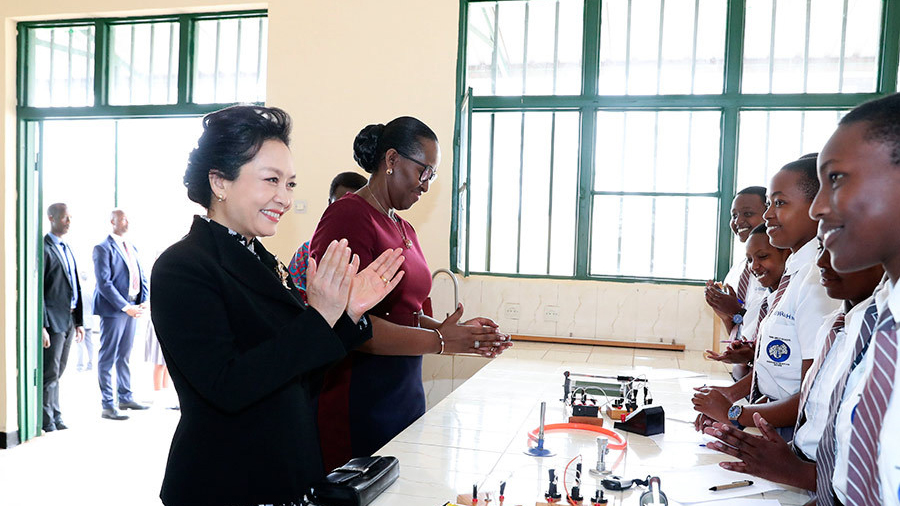 當(dāng)?shù)貢r間7月23日上午,國家主席習(xí)近平夫人彭麗媛在盧旺達(dá)總統(tǒng)夫人珍妮特陪同下參觀位于基加利北部加薩博區(qū)的法維女子中學(xué)。彭麗媛在盧旺達(dá)總統(tǒng)夫人珍妮特陪同下抵達(dá)學(xué)校,受到盧旺達(dá)教育部部長、加薩博區(qū)區(qū)長和法維女子中學(xué)校長等熱情迎接。
