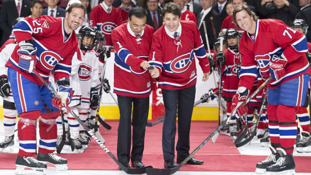 當地時間23日,到訪蒙特利爾的李克強總理在加拿大總理特魯多陪同下,參觀當地“加拿大人”冰球隊,獲贈印有他名字的球衣。