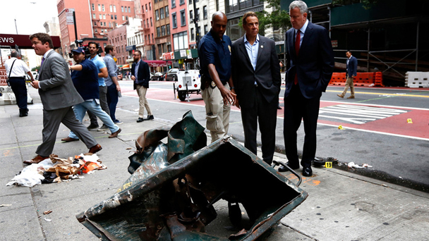 9月18日,紐約曼哈頓爆炸事件中疑似被投放爆炸裝置的垃圾桶曝光,紐約市長白思豪和紐約州長安德魯?科默視察現場。