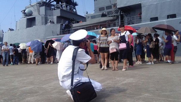 9月14日,參加中俄“海上聯(lián)合-2016”軍事演習的部分艦艇向市民開放。期間,湛江市民可以登上俄“特里布茨海軍上將”號反潛艦(564)和中國海軍廣州艦(168)進行參觀。開放日活動吸引了很多市民,大家有秩序地排隊登艦,并與中俄海軍官兵合影留念。