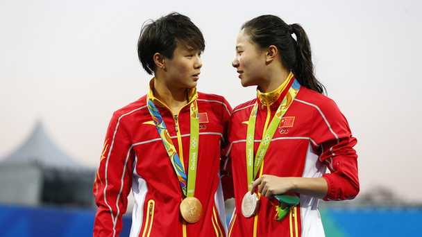 在里約奧運會跳水女子單人3米板決賽中,中國選手施廷懋以406.05分奪得金牌,何姿以387.90分獲得銀牌。