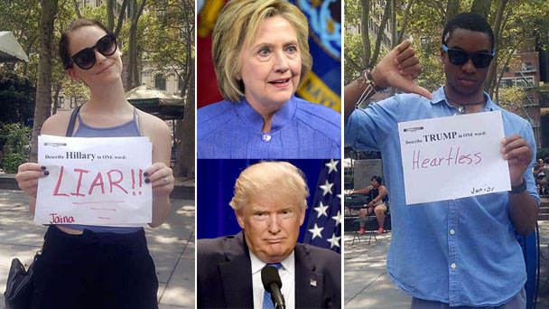 美國共和黨、民主黨兩黨全國大會落下帷幕,特朗普和希拉里分別成為共和黨和民主黨的提名人,這預示著大選正式展開,有媒體戲稱這是“瘋子”和“騙子”的對決,選民認同這一說法嗎?中國日報網獨家采訪了一些選民——用一個詞來形容特朗普和希拉里,不妨看看他們怎么說。