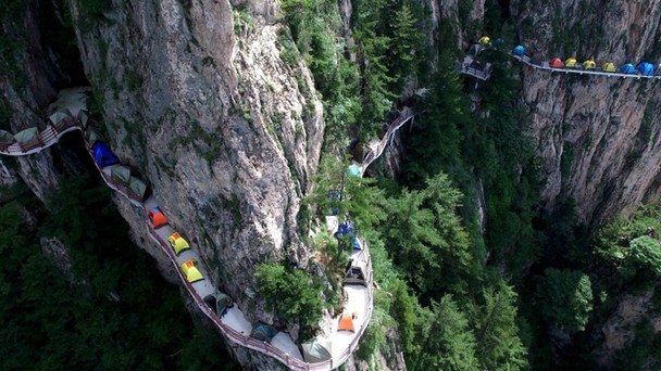 “驢友”組團千米懸空棧道扎帳過夜賞景練膽