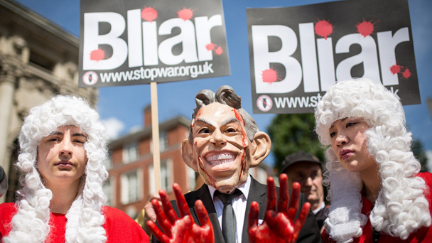 英伊戰調查報告公布 民眾戴布萊爾面具示威
