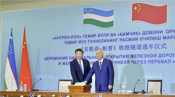 6月22日,國家主席習近平和烏茲別克斯坦總統卡里莫夫在塔什干共同出席“安格連-帕普”鐵路隧道通車視頻連線活動。新華社記者李濤攝   6月22日,國家主席習近平和烏茲別克斯坦總統卡里莫夫在塔什干共同出席“安格連-帕普”鐵路隧道通車視頻連線活動。