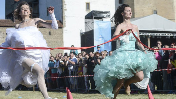 6月4日,在愛沙尼亞納爾瓦,裝扮成新娘的女子參加“國際新娘賽跑”。當(dāng)日,愛沙尼亞第三大城市納爾瓦舉行“國際新娘賽跑”,來自愛沙尼亞、俄羅斯和拉脫維亞的約70名女子裝扮成新娘,進(jìn)行50米賽跑,爭奪鉆戒大獎。