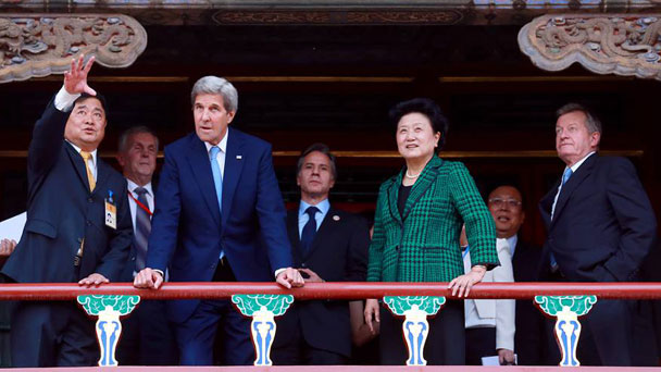 6月5日,國務(wù)院副總理劉延?xùn)|在北京與美國國務(wù)卿克里共同考察了由故宮和美國世界建筑文物保護(hù)基金會合作進(jìn)行的故宮乾隆花園修復(fù)工程。