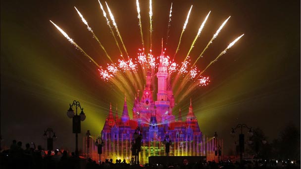 上海迪士尼夜晚燃放煙花 絢爛奇幻城堡