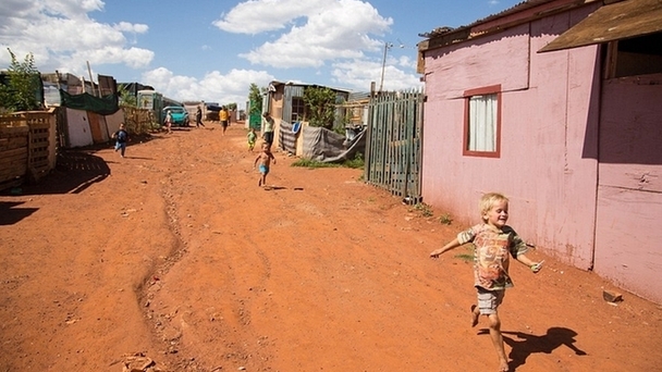 一輛破汽車旁是一個簡陋的棚屋。岌岌可危的棚戶屋前是廢水溝,里面蚊蟲滋生。烈日之下,孩子們在塵土飛揚的荒地上奔跑,這不是電影畫面,而是南非白人窟的真實寫照。