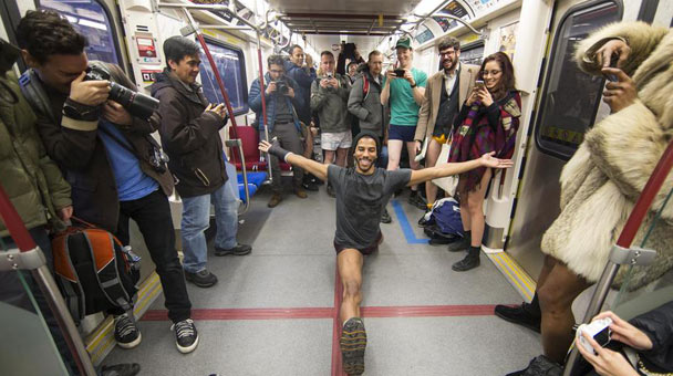 1月10日周日是一年一度的全球運動“不穿褲子搭地鐵日”,全球60多個城市同步進行了不穿褲子乘坐地鐵的集體活動。