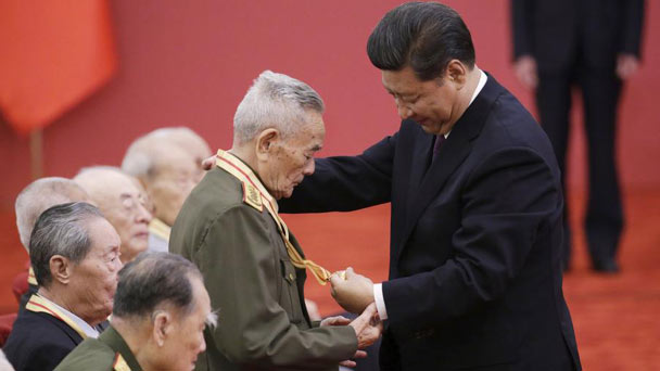今天上午,在人民大會堂,習近平總書記向30名抗戰(zhàn)老戰(zhàn)士老同志、抗戰(zhàn)將領、為中國抗戰(zhàn)勝利作出貢獻的國際友人或其遺屬代表頒發(fā)“中國人民抗日戰(zhàn)爭勝利70周年”紀念章。