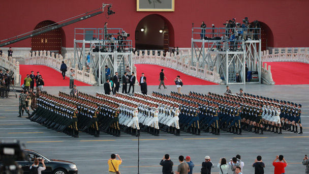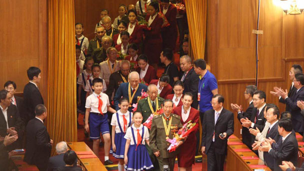 在紀念中國人民抗日戰(zhàn)爭暨世界反法西斯戰(zhàn)爭勝利70周年文藝晚會開演之前,70名抗戰(zhàn)老戰(zhàn)士緩緩步入人民大會堂。