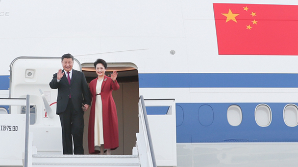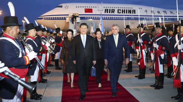 儀仗隊長趨前致敬,軍樂團奏響雄勁有力的進行曲,習近平和彭麗媛沿紅地毯前行,禮兵分列紅地毯兩側,行注目禮。習近平指出,阿根廷是首個舉辦二十國集團領導人峰會的南美國家,今年又恰逢峰會啟動10周年,具有重要意義。