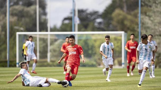 11月28日,在阿根廷布宜諾斯艾利斯的阿根廷國家足球訓練基地,球員張文豪(左二)在訓練賽中。來自北京體育大學中國足球運動學院的青少年足球運動員與教練員正式進駐阿根廷國家足球訓練基地,在這里接受30天的高水平訓練。