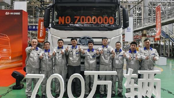 當日,一輛白色解放J7緩緩駛下一汽解放卡車廠總裝車間生產線,這標志著我國自主研發的第700萬輛解放卡車在長春正式下線。 新華社記者 許暢 攝  11月30日,媒體記者在拍攝展出的第一代解放CA10型卡車(左)和解放J7卡車(右)。
