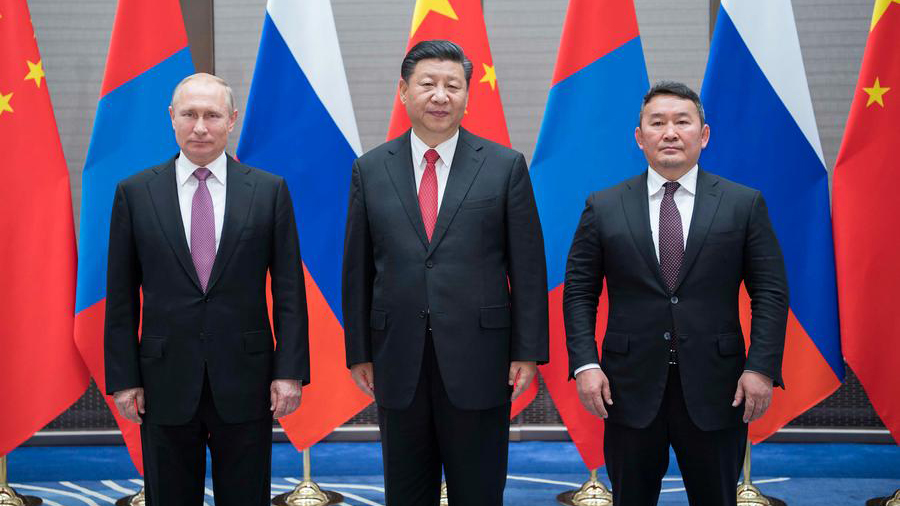 6月9日,國家主席習(xí)近平同俄羅斯總統(tǒng)普京、蒙古國總統(tǒng)巴特圖勒嘎在青島舉行中俄蒙三國元首第四次會(huì)晤。