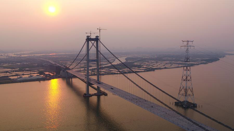 5月25日,廣東省交通集團(tuán)通報(bào),“粵港澳大灣區(qū)”重要交通基礎(chǔ)設(shè)施項(xiàng)目虎門二橋取得重大建設(shè)進(jìn)展。新華社發(fā)  這是無人機(jī)拍攝的坭洲水道橋(5月23日攝)。新華社發(fā)  空中俯瞰坭洲水道橋(5月23日攝)。